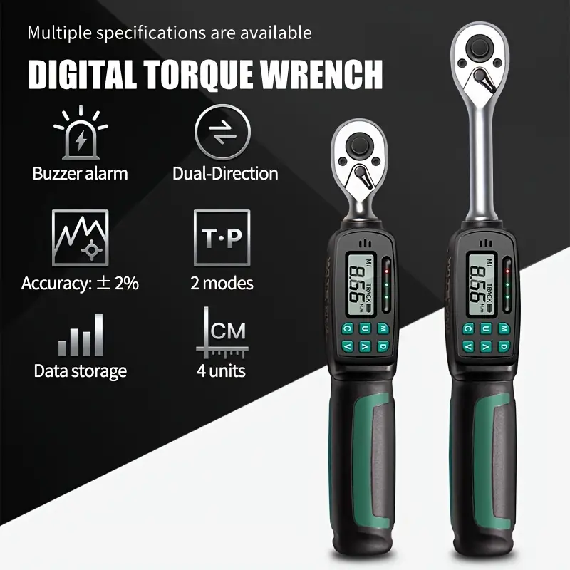 High-precision digital torque wrench with adjustable torque settings, ranging from 0.3N.m to 135N.m. Features a digital display, bidirectional operation, data storage, and a buzzer alarm. Made from metal and plastic, this tool ensures accurate torque measurement for various applications.